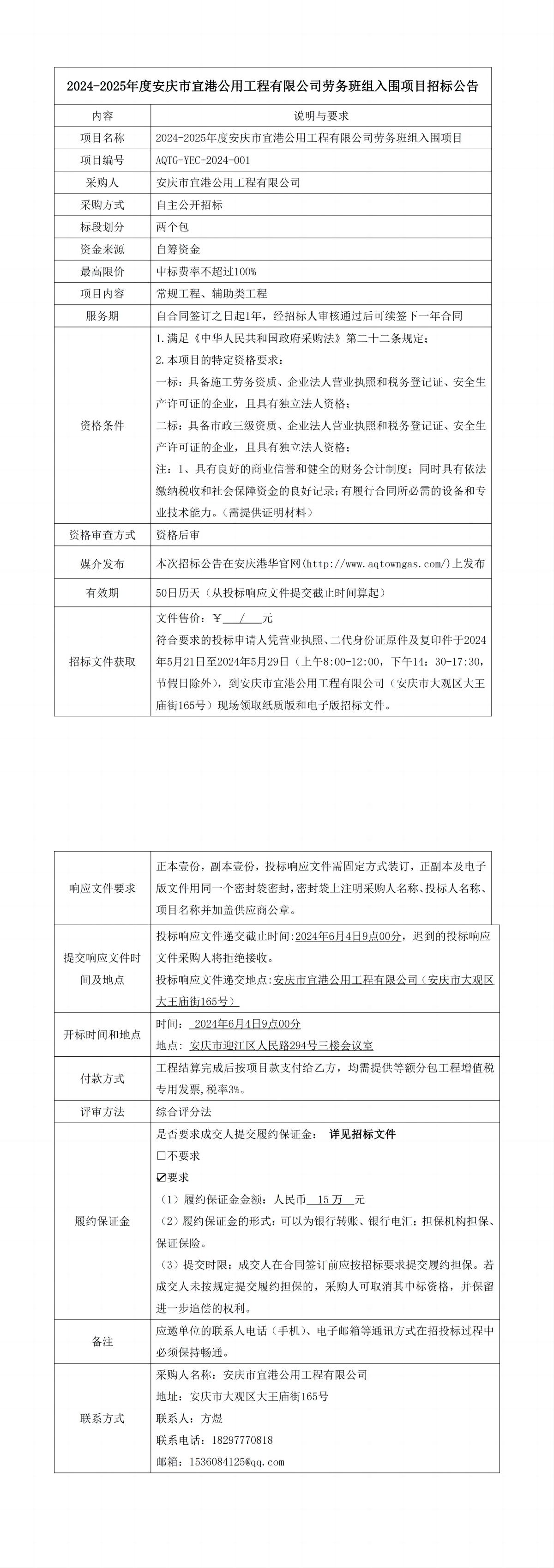 2024-2025年度安慶市宜港公用工程有限公司勞務(wù)班組入圍項目招標(biāo)公告