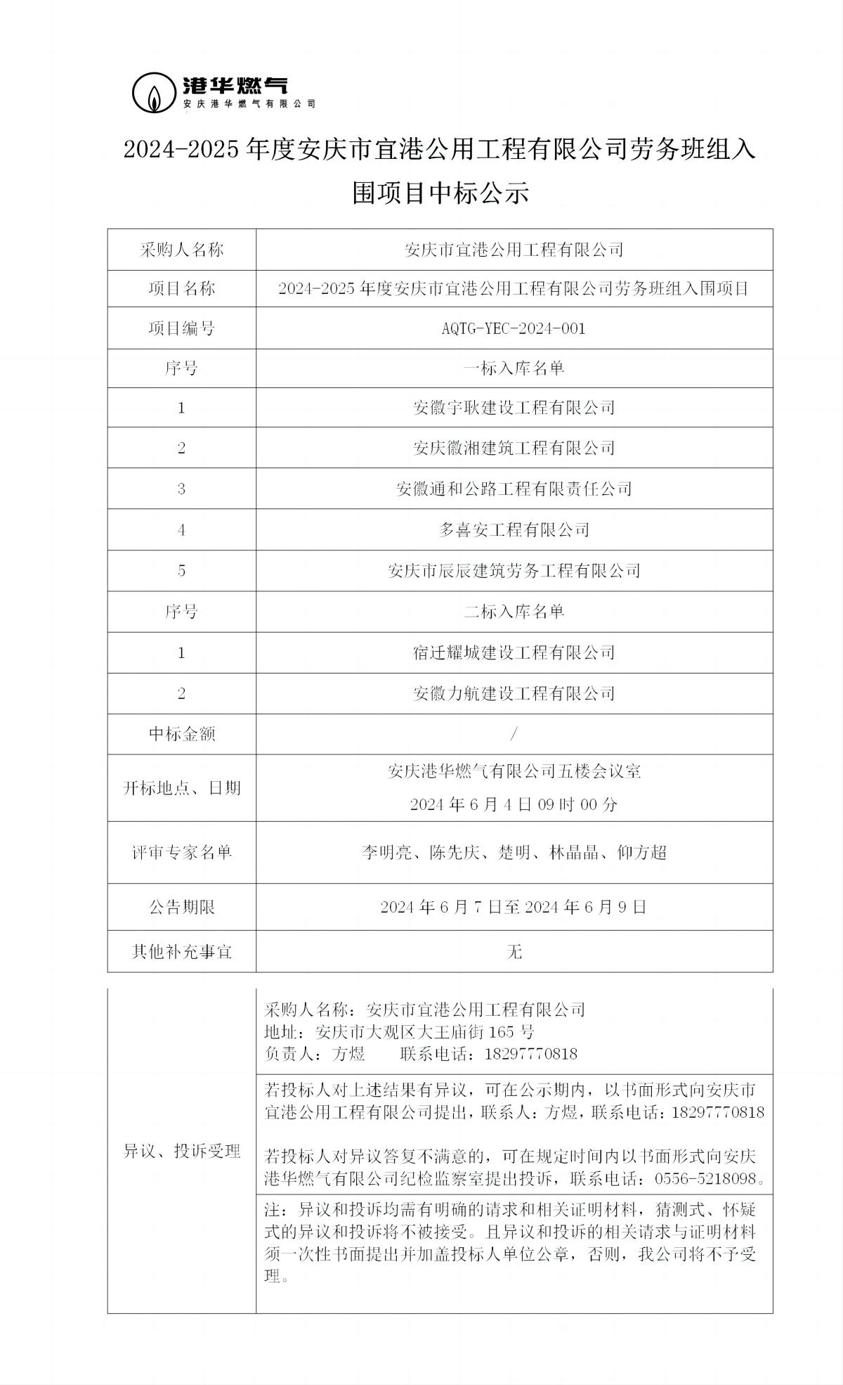 2024-2025年度安慶市宜港公用工程有限公司勞務(wù)班組入圍項目中標公示