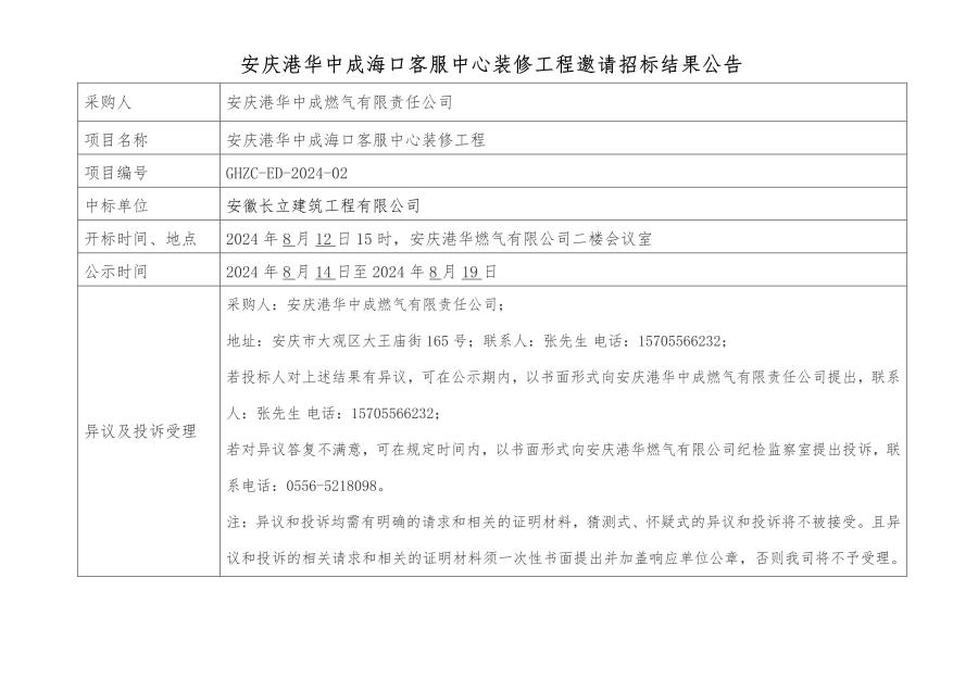 安慶港華中成??诳头行难b修工程邀請招標(biāo)結(jié)果公告