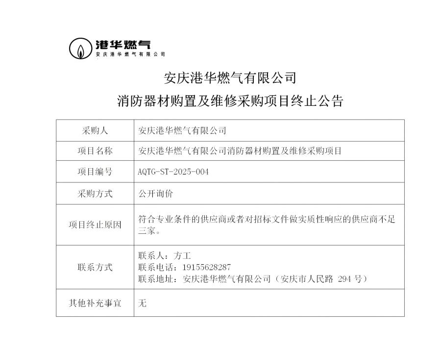 安慶港華燃?xì)庥邢薰鞠榔鞑馁?gòu)置及維修采購(gòu)項(xiàng)目終止公告