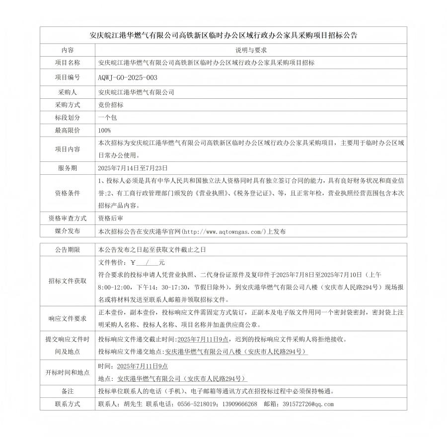 安慶皖江港華燃?xì)庥邢薰靖哞F新區(qū)臨時(shí)辦公區(qū)域行政辦公家具采購(gòu)項(xiàng)目招標(biāo)公告 發(fā)布時(shí)間:2025-07-08    閱讀次數(shù):698次