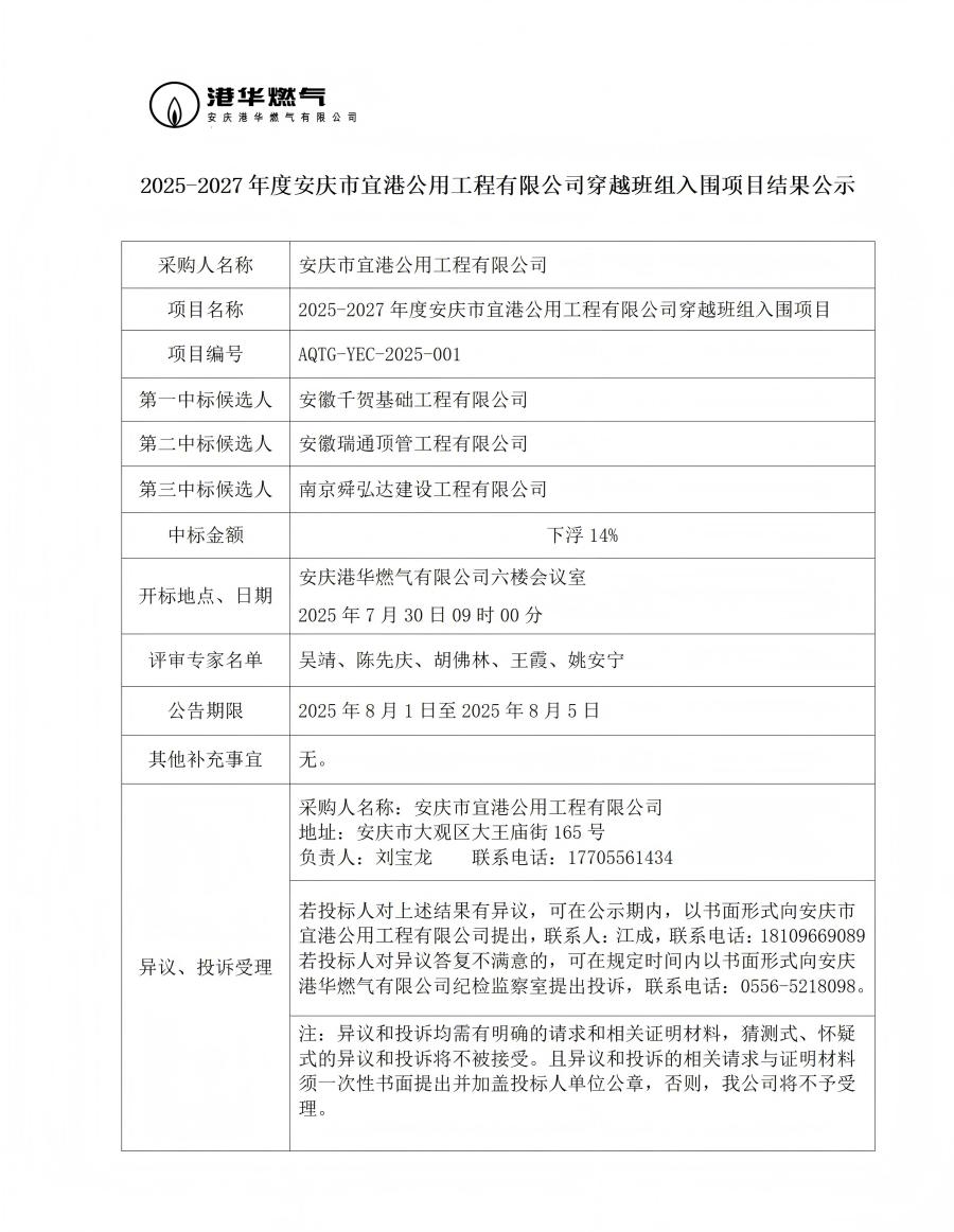 2025-2027年度安慶市宜港公用工程有限公司穿越班組入圍項(xiàng)目結(jié)果公示 發(fā)布時(shí)間:2025-08-01    閱讀次數(shù):429次