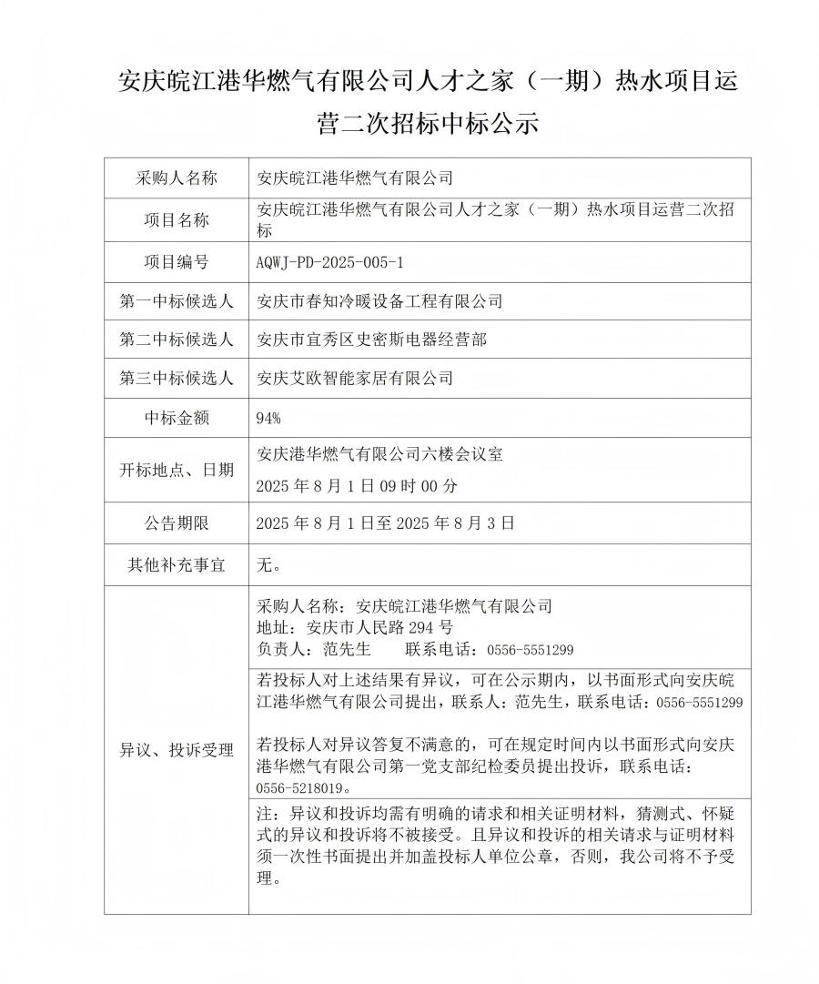 安慶皖江港華燃?xì)庥邢薰救瞬胖遥ㄒ黄冢崴?xiàng)目運(yùn)營(yíng)二次招標(biāo)中標(biāo)公示 發(fā)布時(shí)間:2025-08-01    閱讀次數(shù):438次