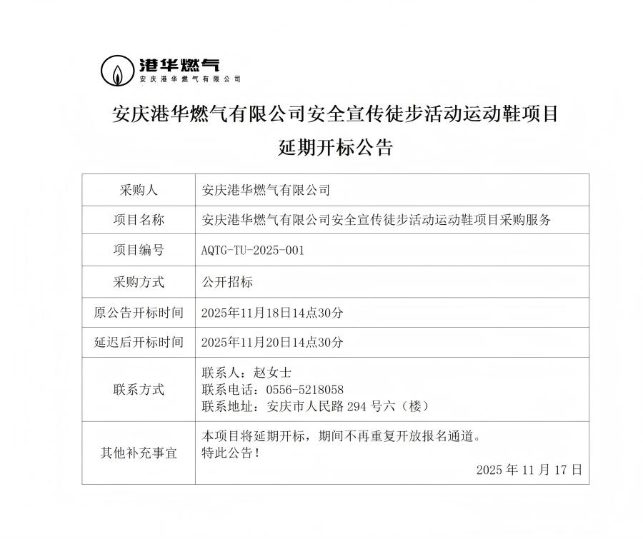 安慶港華燃?xì)庥邢薰景踩麄魍讲交顒?dòng)運(yùn)動(dòng)鞋項(xiàng)目延期開(kāi)標(biāo)公告 發(fā)布時(shí)間:2025-11-17    閱讀次數(shù):379次