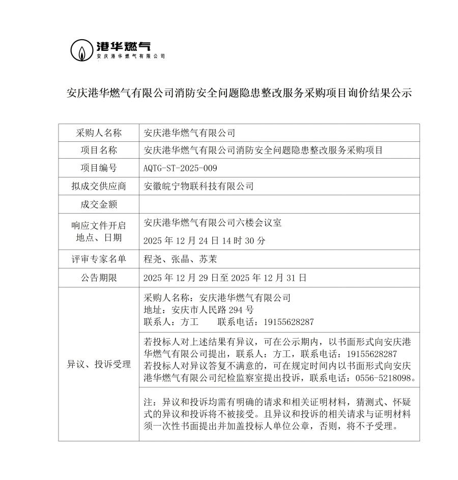 安慶港華燃氣有限公司消防安全問題隱患整改服務(wù)采購項目詢價結(jié)果公示